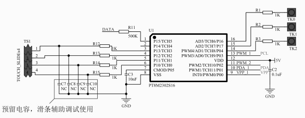 例滾輪時(shí)盡量把觸摸感應(yīng)芯片放在滾輪中心, 滑條與按鍵放在中間位置。